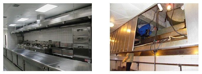 长期使用的排烟风机不洗会有很多的油渍残留在风机底部,电机的转速每分种达到1400转的高速运转,一旦风机底部的油污擦到风轮,会产生高温,从而很容易引起火灾。长期使用的油烟净化器不洗,净化器的内部净化片和过滤网容易堵塞,导致厨房内排烟不畅,油烟道长时间不清洗,会有很多油渍残留在风机上和烟道表面,时间久了会形成油垢,简单清洗是处理不掉的,这样会影响油烟机、烟道的使用,使烟流不易排除。本公司采用高压射流加强化油头剂,对烟道进行除油处理后,再做保养,使油烟气流明显好转,并形成保护膜使油渍不易残留在表面。人工铲除油垢+超强金属专用清洁剂,对油烟机表面油污清除效果显著,无毒、无味、不伤金属和瓷面。 |